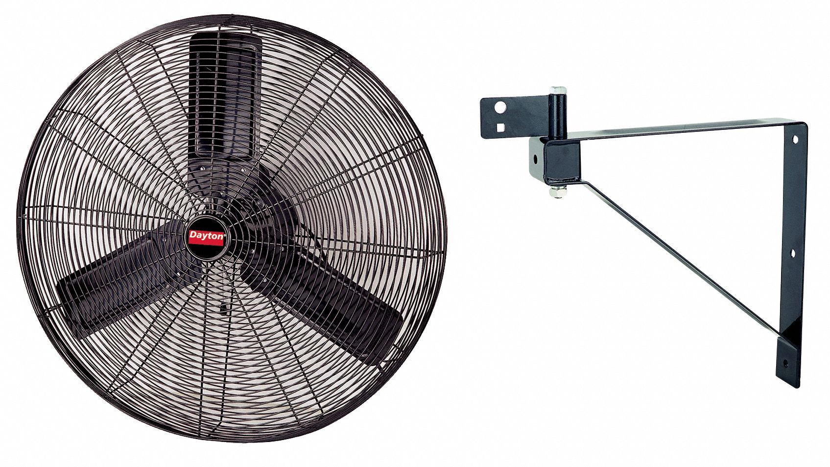 Light-duty industrial wall-mount fans cool light manufacturing areas, warehouses, and other dry, clean spaces where floor space is limited. These air circulators are used where an office fan is inadequate and a heavier-duty or wet-location industrial fan isn't needed. Compared to standard-duty industrial fans, these light-duty fans are made of lighter-gauge materials and have a lower-horsepower motor with less-robust bearings. Brand: DAYTON Blade Diameter: 30 in Wheeled Base: Stationary Oscillation: Non-Oscillating Watts: 320/225 Number of Speeds: 2 Voltage: 120V AC Phase: 1 Air Flow: 4,650/7,250 cfm Motor HP: 1/4 hp RPM: 1100/900 Amps: 2.9/1.9 Fan Mounting Location: Ceiling; Wall Air Velocity @ 10 Ft.: 1010/680 fpm Air Velocity @ 20 Ft.: 715/480 fpm Air Velocity @ 40 Ft.: 370/350 fpm Air Velocity @ 60 Ft.: 280/250 fpm Assembly Required: Yes Sound Level: 77 dBA Max. Ambient Temp.: 104 F Hz: 60 Hz Motor Enclosure: Open Air-Over Motor Insulation: Class B Motor Type: Permanent Split Capacitor Thermal Protection: Automatic Reset Bearing Type: Ball Fan Cord Length: 9 ft NEMA Plug Configuration: 5-15P Height: 34-1/2 in Width: 33 in Depth: 24 in Number of Blades: 3 Blade Material: Aluminum Shaft Dia.: 17 mm Fan Housing Material: Steel Color: Black Guard Material: Steel Wire Guard Finish: Polyester Powder Coated Black Number of Conductors: 3 Height Adjustment: Fixed Height Drive Type: Direct Drive Standards: cULus Listed Includes: Mounting Hardware; Secondary Safety Support Cable; Wall/Ceiling Bracket Environmental Applications: Industrial Product Type: Light-Duty Industrial Fan.