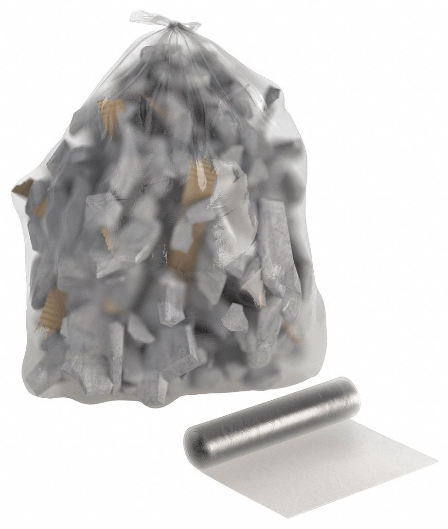 These trash bags resist tears and punctures and can hold heavy or sharp trash such as wood, metal, and concrete. Polypropylene bags do not stretch and are stronger and less likely to puncture or tear than super hexene HAO bags. They are also known as contractor bags and can be reused multiple times. Super hexene HAO bags are stronger and less likely to puncture or tear than LLDPE or HDPE bags, and they stretch to conform to waste with sharp corners or edges. Brand: GRAINGER Bag Product Grouping: Trash Bag Capacity: 56 gal % Recycled Content: 0% Thickness: 0.98 mil Color: Clear Bag Closure Type: None Width: 43 in Height: 48 in Max. Load: 70 lb Bottom Seal Type: Star Scent: Unscented Legend: No Legend Package Configuration: Coreless Roll Bags per Roll: 15 Rolls per Package: 10 Application: Food Service; Heavy Weight; Hospital; Office Trash Bag Material: Super Hexene HAO Display Qty: 150 Display Sell UOM: PK.