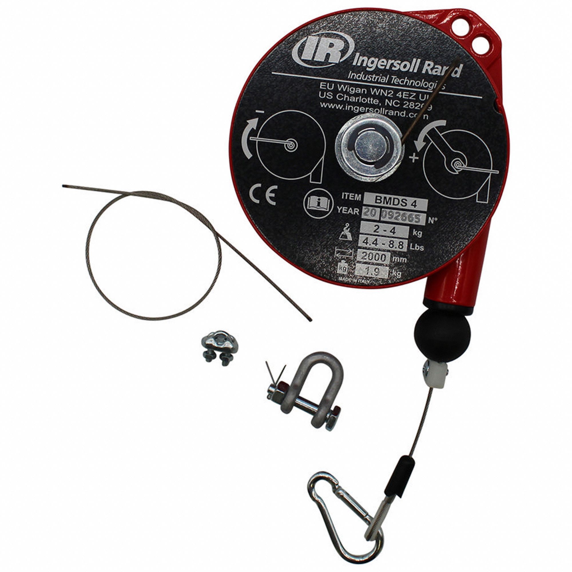 General purpose tool balancers suspend and position tools in light-duty applications that don't require a heavy-use balancer. They have a standard, non-tapered drum and exert a slight pull on the tool when their cable is extended. Their adjustment mechanism increases or decreases the cable tension to properly balance the tool. Brand: INGERSOLL RAND Manufacturer Part Number: BMDS-4 Series: BMDS Drum Type: Standard Ratchet Lock: No Lock Mechanism: Non-Locking Max. Tool Weight: 8.8 lb Min. Tool Weight: 4.4 lb Cable Length: 6.5 ft Housing Material: Aluminum Reel Mount Type: Suspension Shackle Tool Attachment Type: Spring Clip Reel Height When Retracted: 11 in Tension Adjustment: Wrench Spring Tension Adjustment Rotation Type: Fixed Shock Absorption: Not Included Spring Fail Mechanism: Yes Cable Material: Stainless Steel Reel Weight: 4.4 lb Overall Width: 5-13/16 in Overall Depth: 3-3/8 in Includes: Upper Suspension Shackle Features: Adjustable Stroke Limiting Device; Anti Friction Cable Guide Max. Tool Weight Grouping: 5 to 10 lb For Tool Weighing: 4.40 to 8.80 lb Length of Cable: 5 ft to 8 ft.