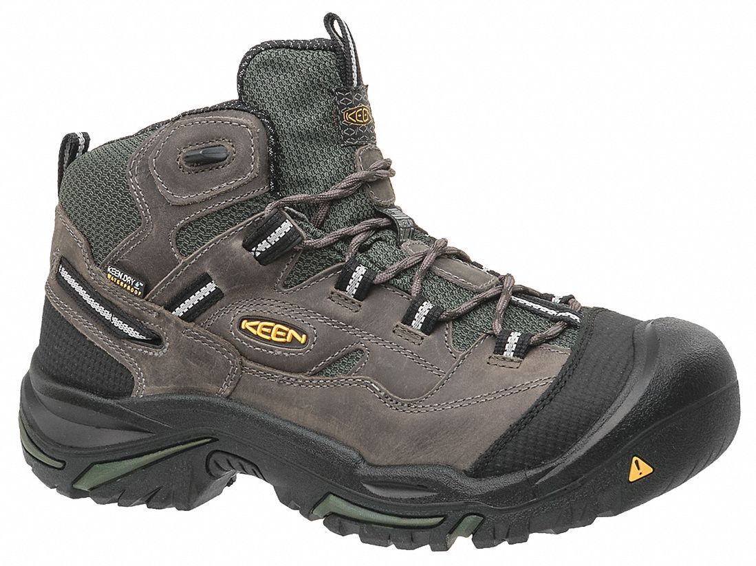 Brand: KEEN Toe Cap Material: Steel Gender: Men's Width: D Metatarsal Guard: No Color: Gray Safety Criteria: Better Slip-Resistance; Chemical-Resistant Sole; Defined Heel; Electrical Hazard (EH); Metal Chip-Resistant Sole; Non-Marking Sole; Oil-Resistant Sole; Steel Toe; Waterproof; Wide Toe Cap Upper Material: Leather; Mesh Midsole Material: Polyurethane Outsole Material: Rubber Manufacturer-Suggested Sole Slip Rating: Better Conductive: No Electrical Hazard Rated: Yes Static Dissipative: No Puncture-Resistant Sole: No Metal Chip-Resisting Sole: Yes Oil-Resisting Sole: Yes Chemical-Resisting Sole: Yes Waterproof: Yes Insulated: No Completely Non Metallic: No Non Metallic Upper: No Non-Marking Sole: Yes Wide Toe Cap: Yes Ninety-Degree Heel: Yes Heel Definition: Defined Heel Removable Insole: Yes Upper Color: Gray; Olive Waterproof Type: Membrane Overall Height: 5 in Closure: Lace Up Shank Material: TPU Toe Shape: Round Construction: Direct Attached Insole Material: EVA Insole Technology: Compression Molded; Removable For Outdoor Traction: No Style Number: 1011243 Maximum Heat Rating: 380 F Style Family: Hiker Boot Manufacturer Part Number: 1011243 All-Leather Upper: No Midsole Technology: Dual Density Liner Technology: Hydrophobic Slip-Resistance Value - Mark II - Oily/Wet: 0.84 Slip-Resistance Value - Mark II - Wet: 0.84 Size: Multiple Slip-Resistance Rating (Mark II Test Values): (Oily/Wet): 0.84; (Wet): 0.84 ASTM Standards Met: Compression (C); Electrical Hazard (EH); Impact (I) Display Qty: 1 Display Sell UOM: PR Color Family: Gray.
