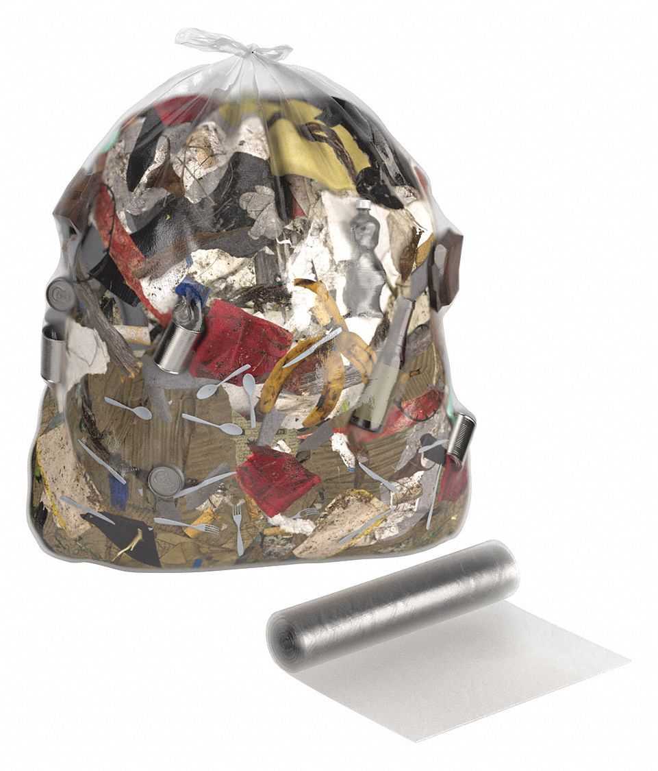 These trash bags are made from LLDPE (linear low-density polyethylene), which is a plastic that stretches to conform to waste and resists tears, impacts, and punctures. They hold discarded items that have sharp corners or edges, including glass shards, sticks, and broken-down cardboard. Brand: GRAINGER Bag Product Grouping: Trash Bag Capacity: 56 gal % Recycled Content: 0% Thickness: 1.2 mil Color: Clear Bag Closure Type: None Width: 43 in Height: 48 in Max. Load: 85 lb Bottom Seal Type: Star Scent: Unscented Legend: No Legend Package Configuration: Coreless Roll Bags per Roll: 10 Rolls per Package: 10 Application: Contractor; Extra Extra Heavy Weight; Food Service; Hospital; Landscaping; Office Trash Bag Material: LLDPE Display Qty: 100 Display Sell UOM: PK.